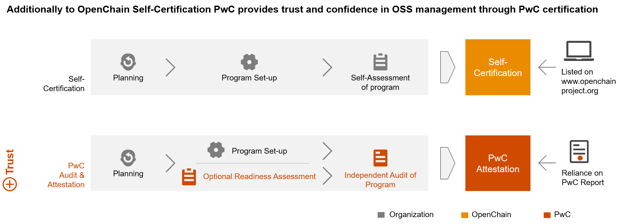 • PwC provides TRUST in the OSS compliance of suppliers. The software receiving organisation can reduce its internal resources regarding scanning and reviewing any received software and speed up approval processes.